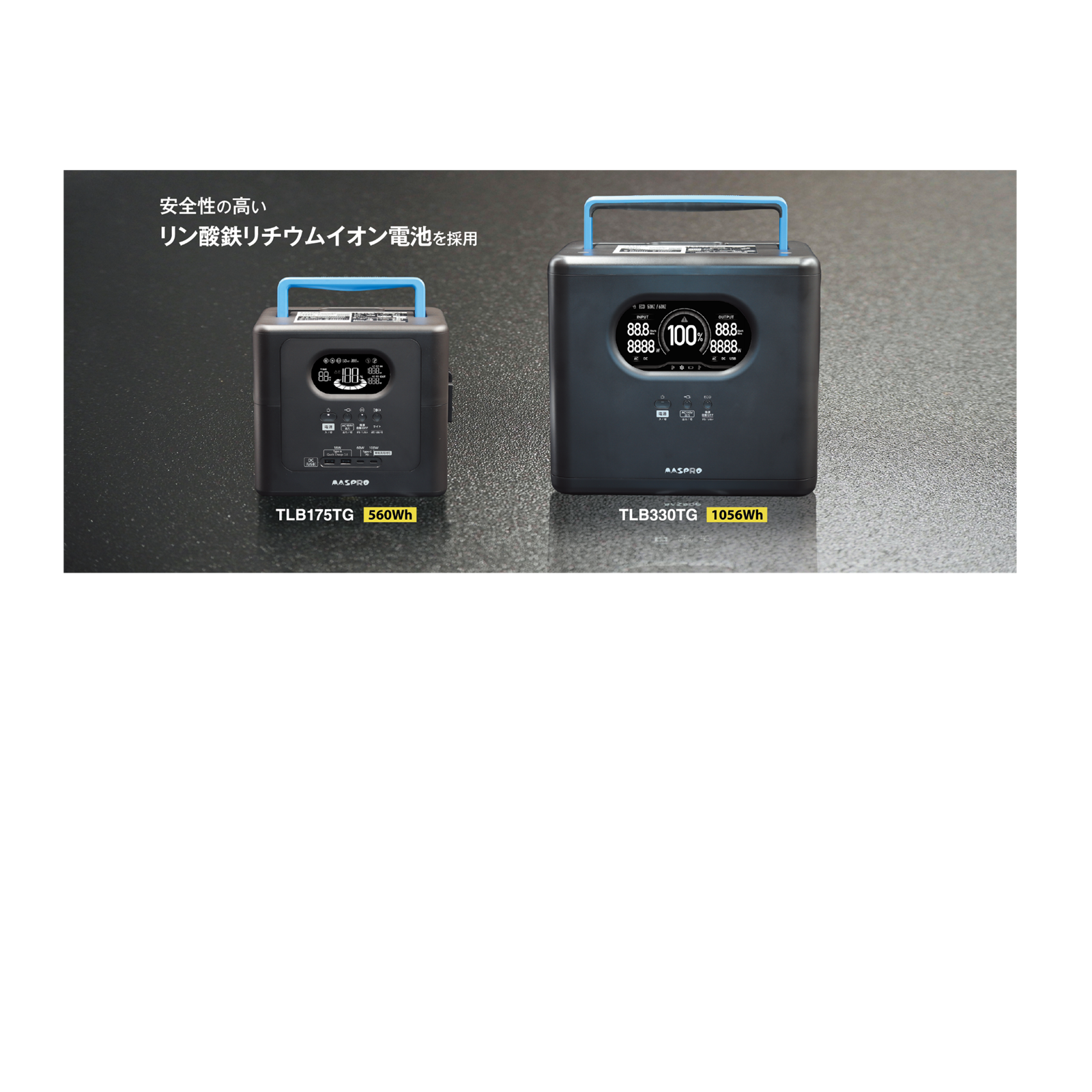 安全性の高いリン酸鉄リチウムイオン電池を搭載しています。リン酸鉄リチウムイオン